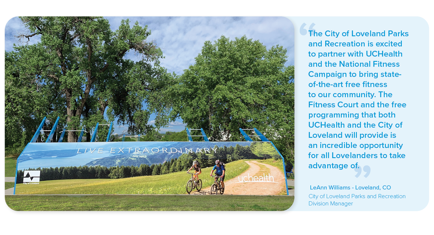 “National Fitness Campaign is proud to announce the extension of our partnership with UCHealth through 2024 to continue our journey to improve the quality of life in Colorado. NFC continues to embrace our mission of getting people moving outdoors by helping communities combat the fiscal and humanitarian costs of inactivity.”