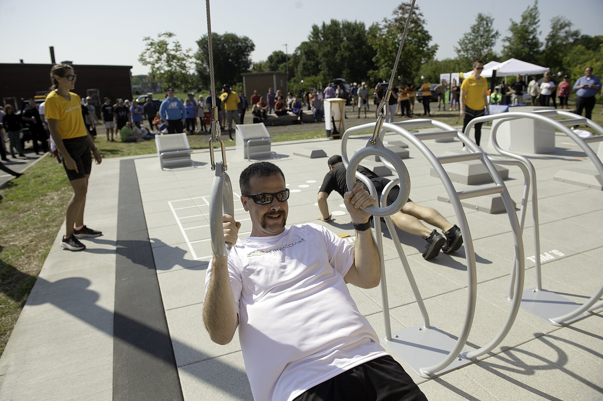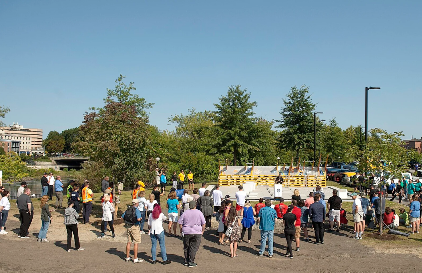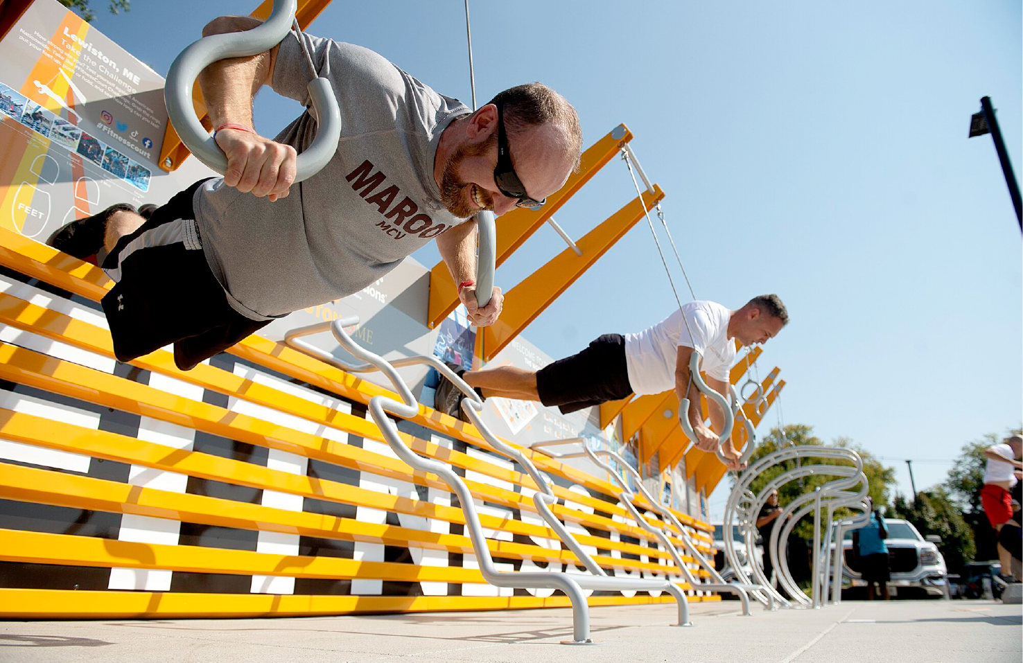 Maine’s second largest city, the City of Lewiston, welcomed the state’s first Fitness Court® in September 2022, just blocks away from Community Health Options’ headquarters. The picturesque backdrop of the Androscoggin River that accompanies Simard-Payne Park is a perfect location for The Fitness Court®, creating a space to promote social interaction, pedestrian movement and healthy living.