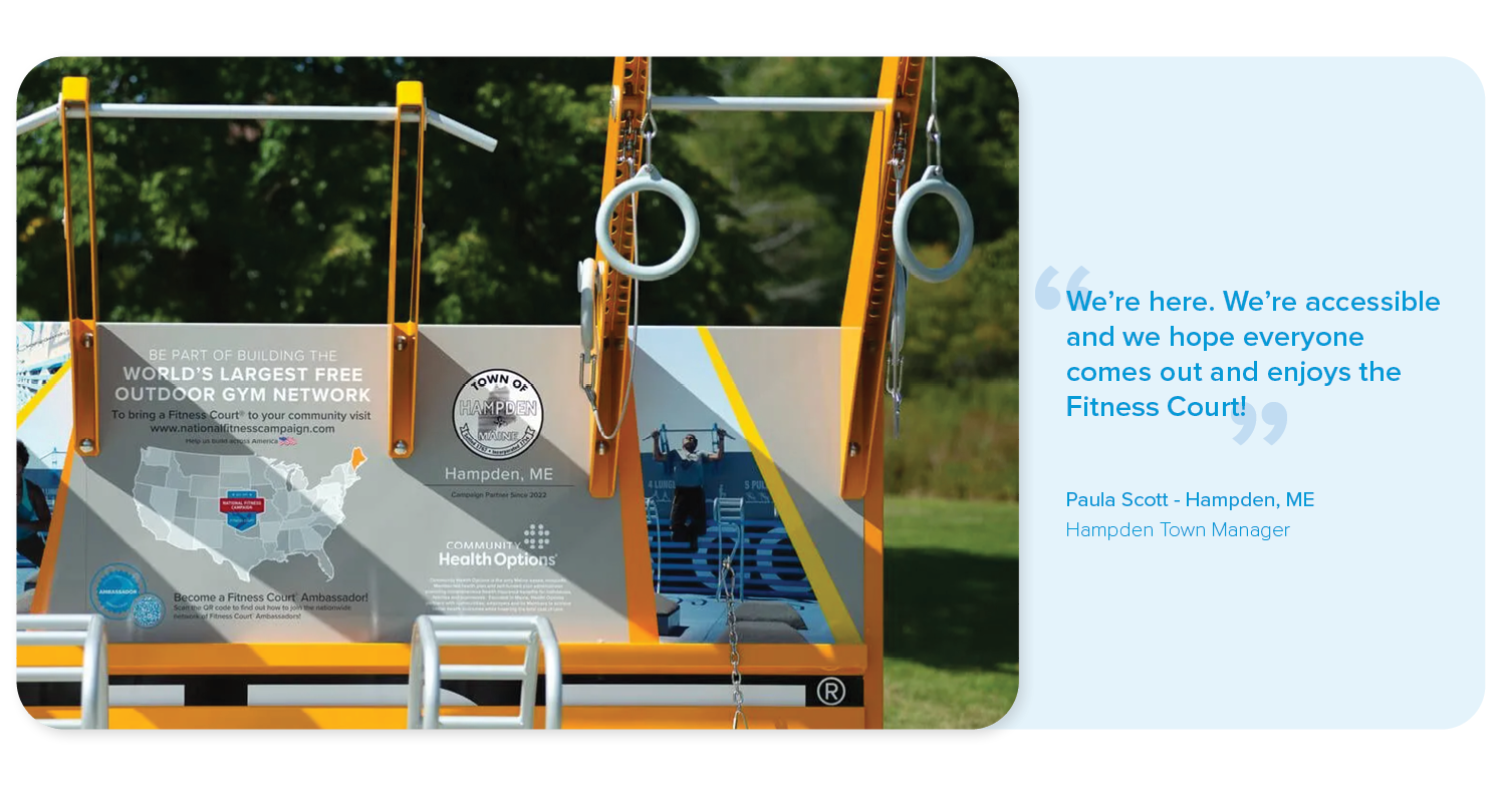 The Community Health Options and NFC Campaign in Maine, is delivering outdoor wellness infrastructure to help communities stay active across the state, in an effort to change health outcomes. Out of Maine's 16 counties, there are open Fitness Courts® across 2.