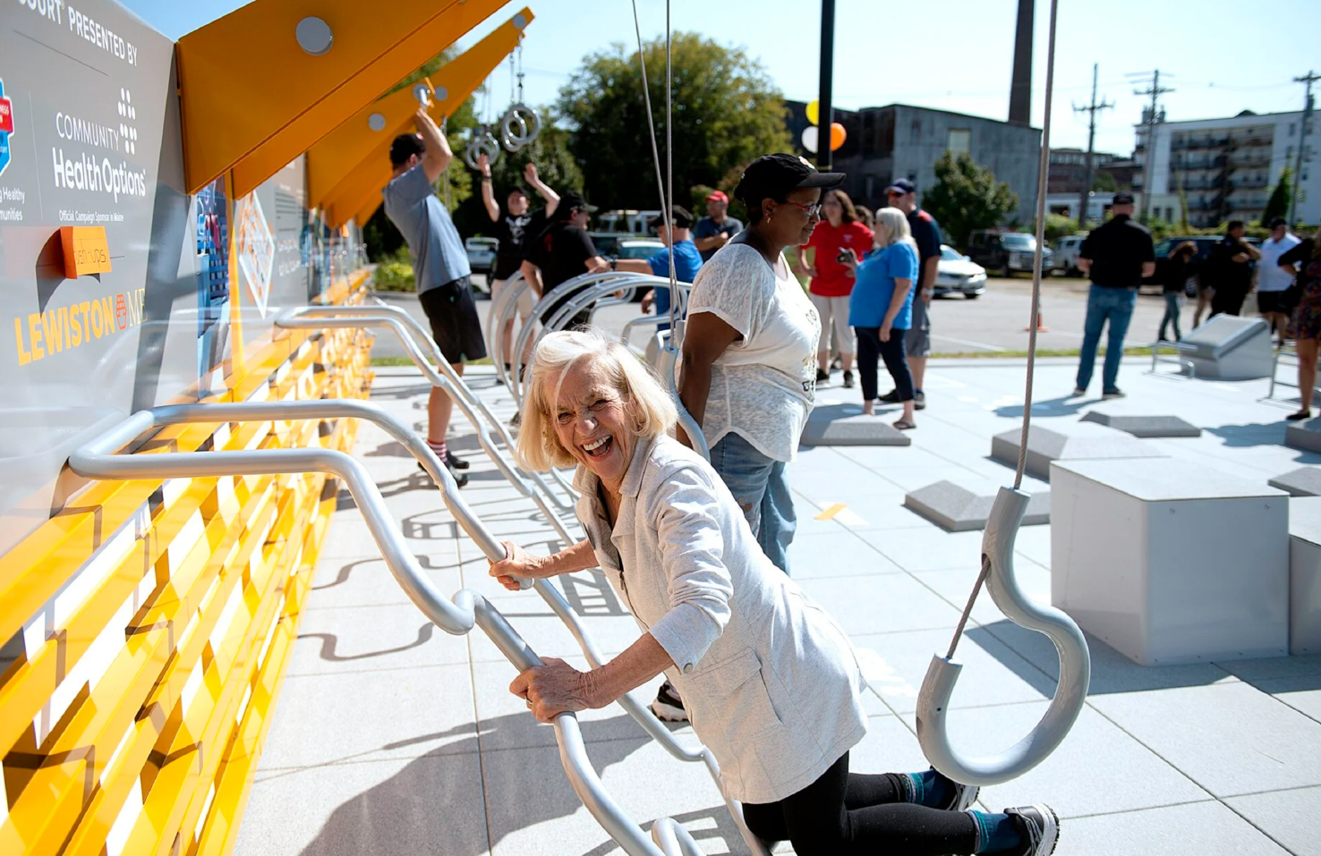 Maine’s second largest city, the City of Lewiston, welcomed the state’s first Fitness Court® in September 2022, just blocks away from Community Health Options’ headquarters. The picturesque backdrop of the Androscoggin River that accompanies Simard-Payne Park is a perfect location for The Fitness Court®, creating a space to promote social interaction, pedestrian movement and healthy living.