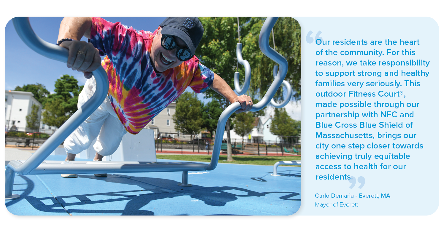 “As we continue our mission of building a Fitness Court within a 10-minute bike ride of every American, the National Fitness Campaign is proud to extend our sponsorship with Blue Cross Blue Shield of Massachusetts. Together, we're building a wellness culture focused on health equity to combat the rising costs of sedentary lifestyles.”