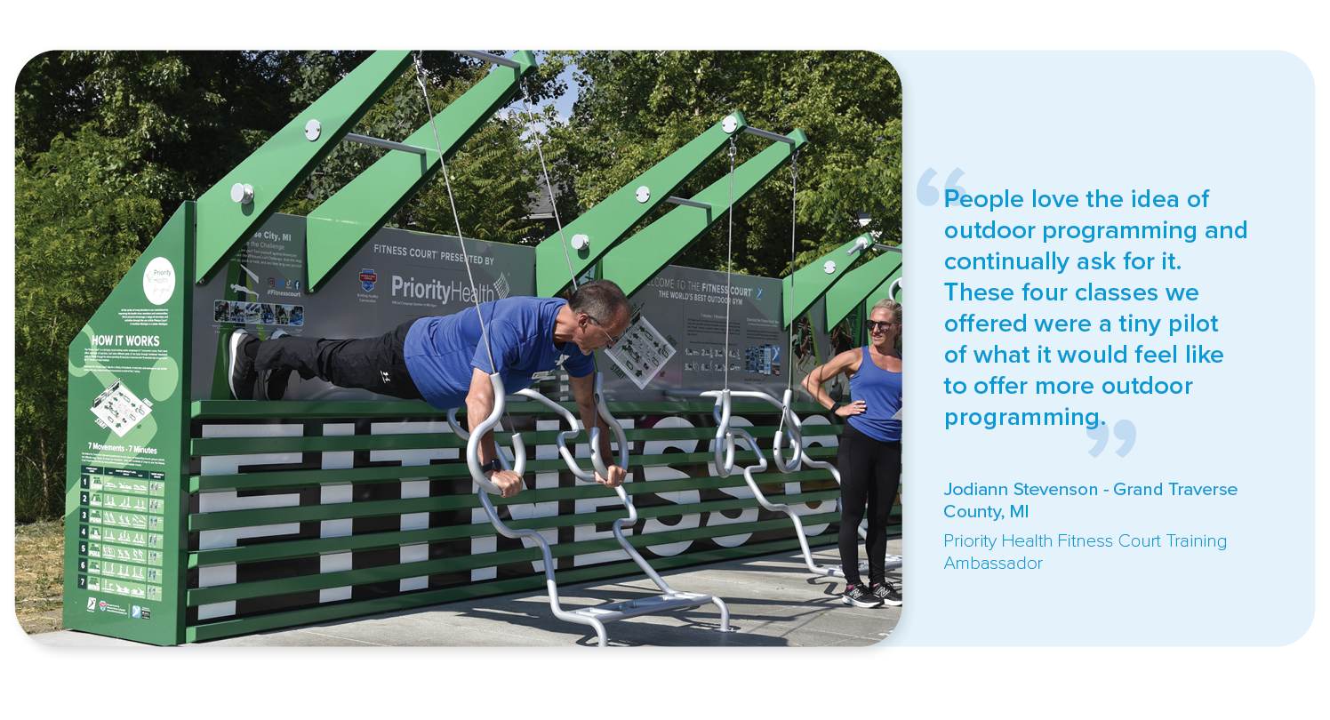 The Priority Health and NFC Campaign in Michigan is delivering outdoor wellness infrastructure to help communities stay active across the state, in an effort to change health outcomes. Out of Michigan's 83 counties, there are open Fitness Courts® across 17.