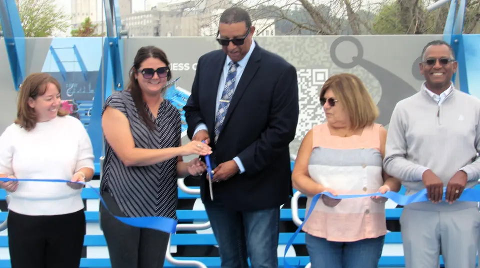 Mayor David Goins marks the opening of Alton's new Fitness Court at Riverfront Park