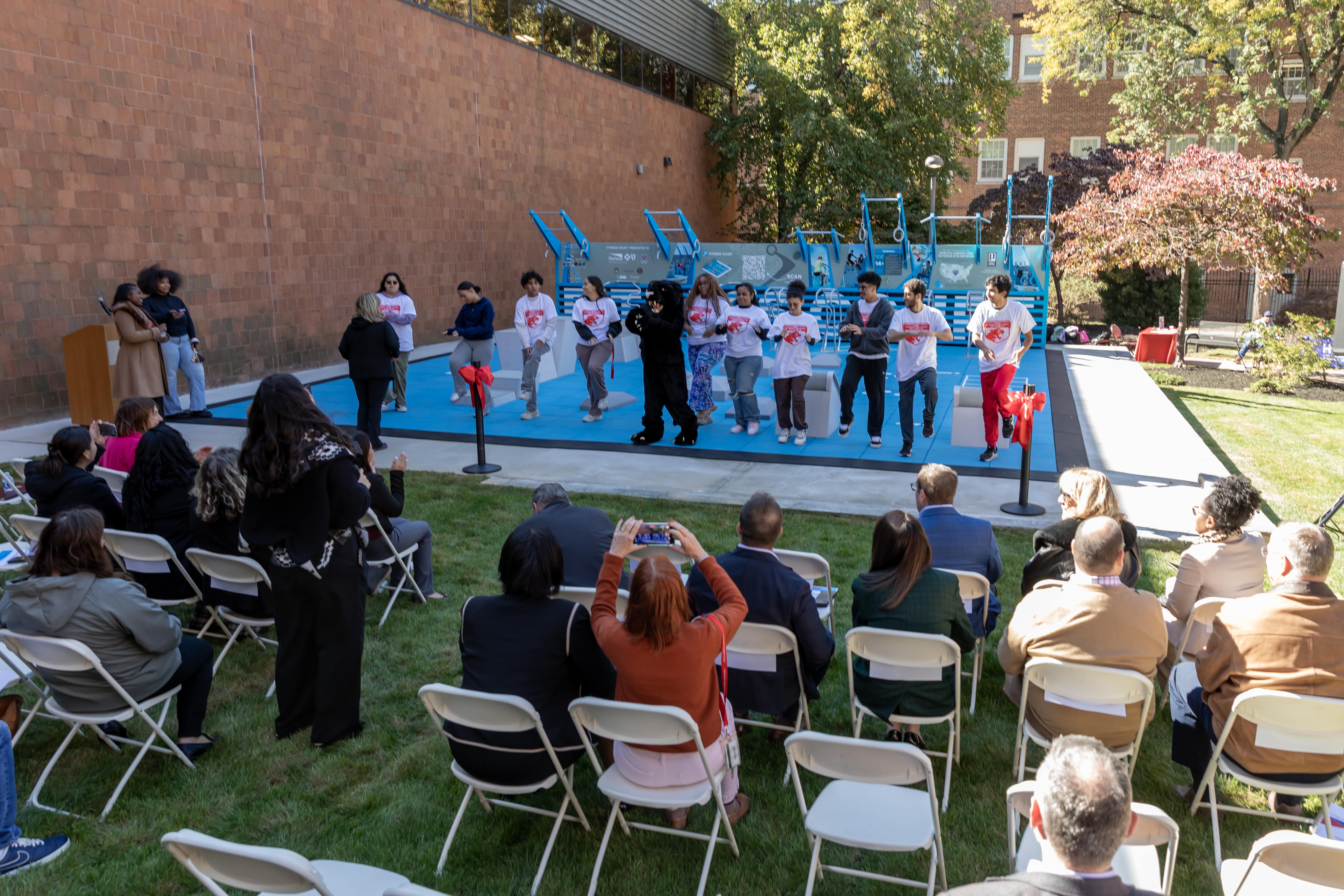 The day began with a VIP reception in the Paterson Room, where Fitness Court ambassadors welcomed dignitaries and project supporters with light refreshments. Attendees included PCCC leadership, local civic leaders, and project sponsors. After mingling, the VIP group was escorted to the Outdoor Wellness Courtyard to begin the official launch ceremony.